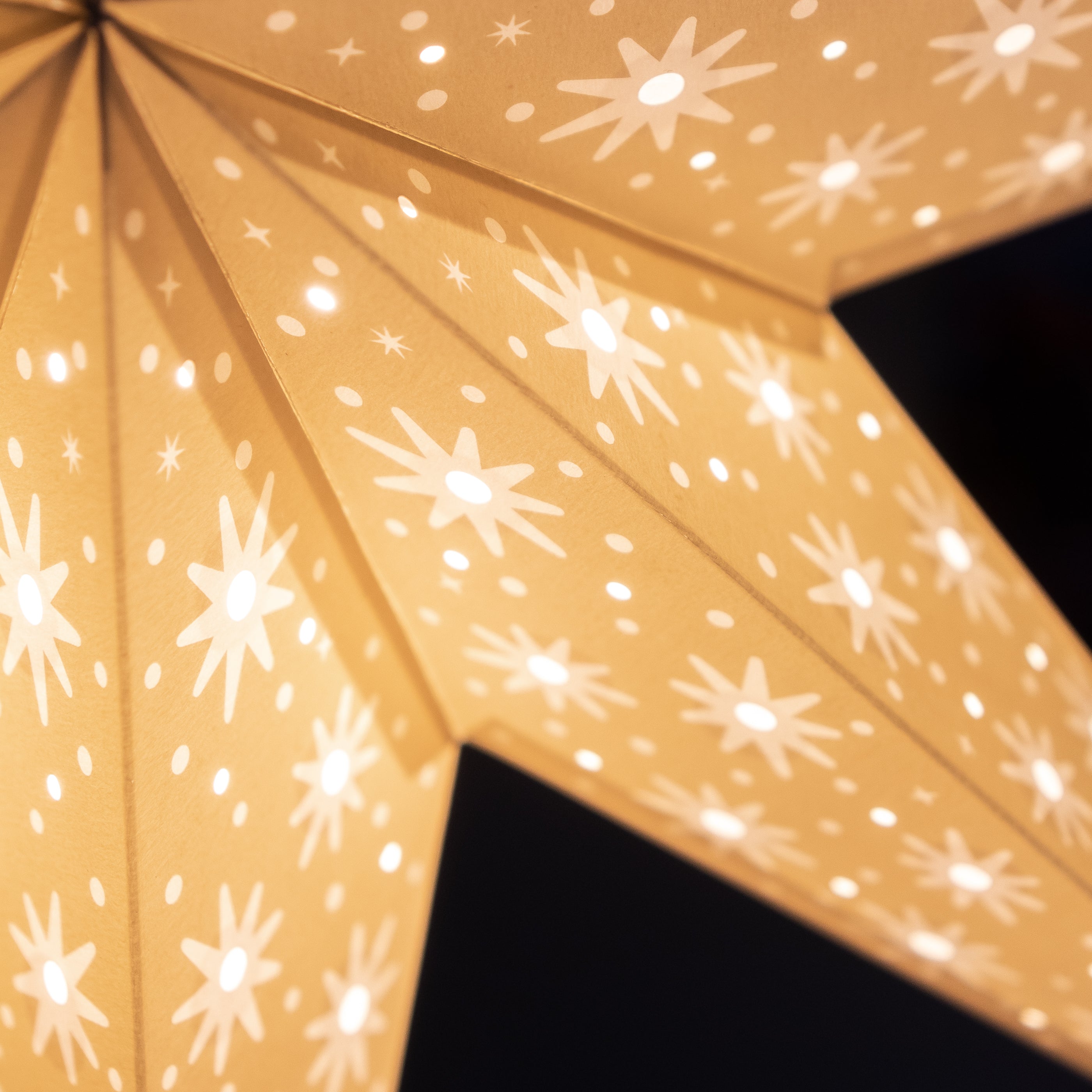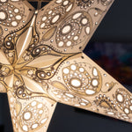 Using the two cords provided, gently bring the two outer points together. If illuminating, place over light source and tie cords firmly to secure in place. Do not pull the cords to open your star.