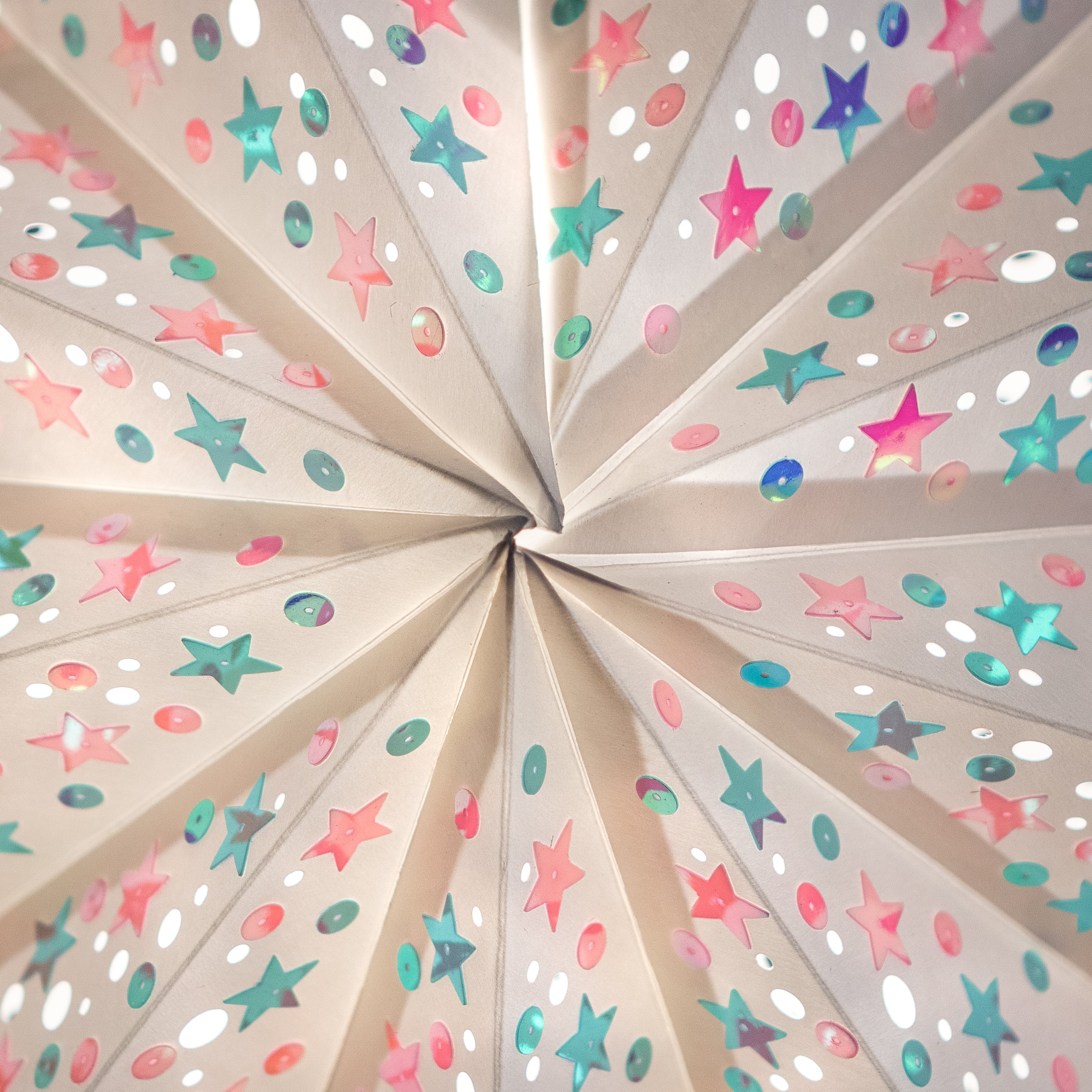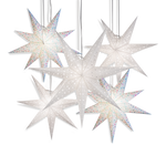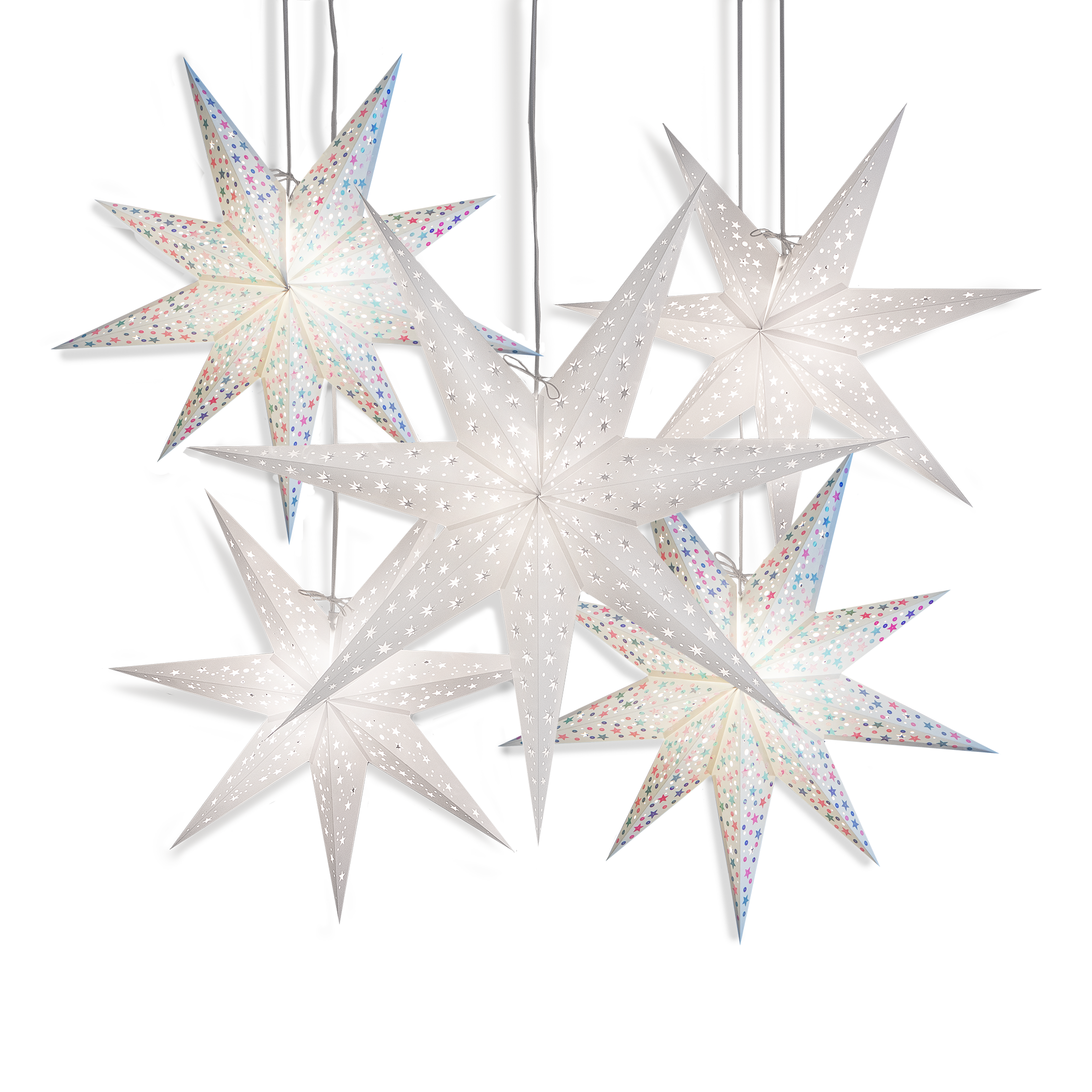 Add a celestial touch to your wedding planning with our elegant collection of five handmade paper star lanterns! The perfect wedding decorations, our sparkling selection of clear white star lights includes two nine-pointed lanterns layered with hundreds of iridescent sequins which reflect light in a delicate twinkle. Display in a cluster to accentuate a bar, gift table or dance floor. Looks gorgeous teamed with cascades of warm white fairy lights! Also includes three classic white seven-pointed starlights decorated with tiny hand-cut star perforations. A match made in heaven! This bundle provides magical lighting effects as you dance beneath the stars!